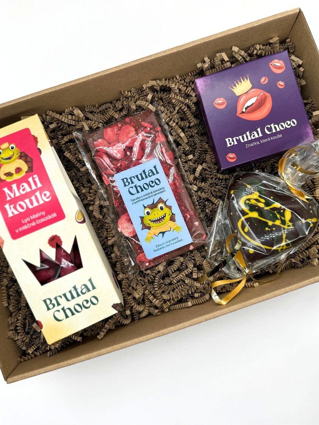 Obsah boxu: Malikoule v mléčné čokoládě, malá bonboniera: Brutální vyznání, sypaná tabulka, pistáciové srdce v mléčné čokoládě
