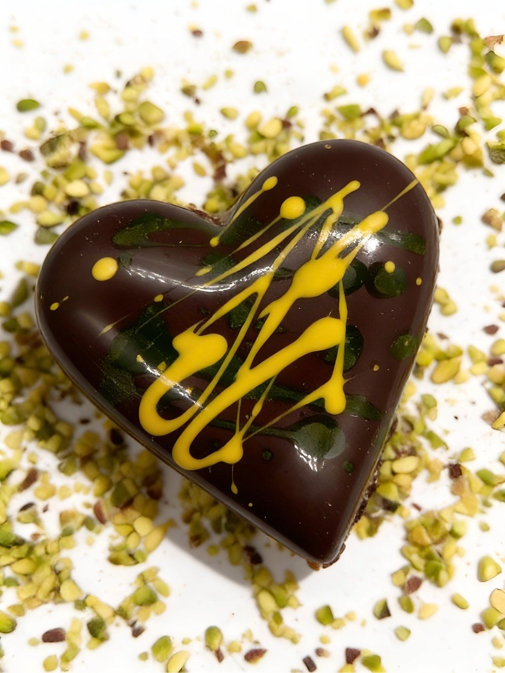 Tohle srdce je zážitekNejdřív slyšíš ostré křupnutí hořké čokolády. Hned potom se ti po jazyku rozleje hutný pistáciový krém, který tě uzemní svou intenzitou. A do toho všeho ti zuby narazí na křupínky. Je to textura, která tě donutí zavřít oči a na chvíli zapomenout, že jsi v práci. Nebo nedejbože v Bruntále. |