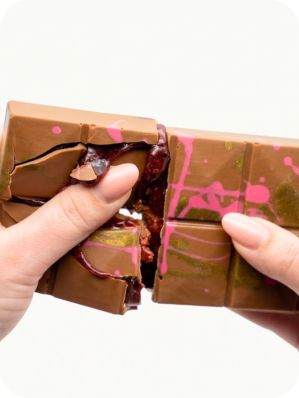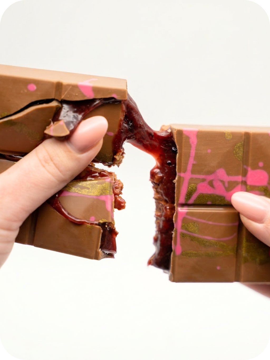 Tahle čokoláda je zážitekNejdřív uslyšíš to správné prasknutí tlusté vrstvy mléčné čokolády. Žádné šetření materiálem. Pak to přijde – višňová exploze. Kyselá, výrazná chuť ovoce a nakonec ji převálcuje sladký, tekutý karamel. |
