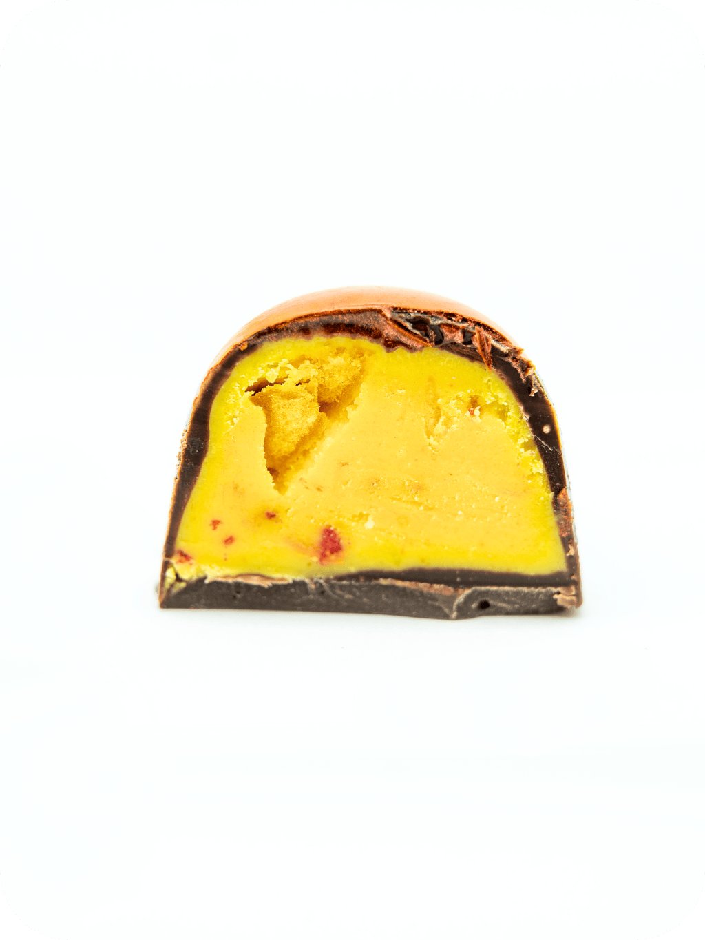 Mango a marakuja v bílé čokoládě s křupavými sušenkami, které jsou tak ovocně intenzivní, že ti připomenou, že slunce opravdu existuje – jen ne v Bruntále. Tohle je křupavá tropická brutalita zabalená do bílé čokolády, která ti při prvním kousnutí pošle závan exotiky přímo do obličeje. Zkrátka pralinka, pro kterou bys jel i do Bruntálu. A máš štěstí, že nemusíš (je to daleko a nic tu není), stačí si ji objednat a Bruntál přijede za tebou.