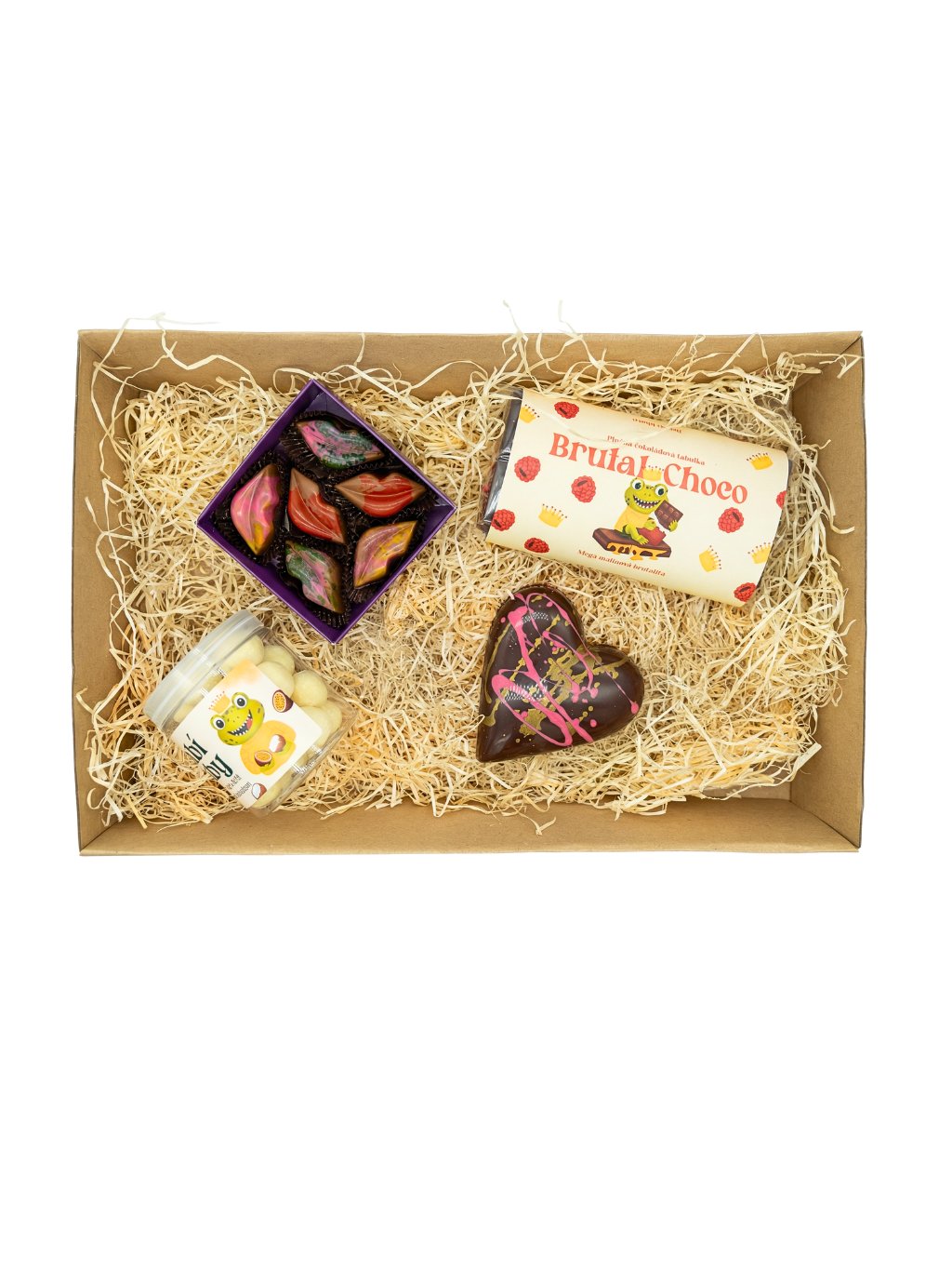 Obsah boxu: Malá bonboniéra: Princezna, malá dóza: Žabí zuby v bílé čokoládě a kokosu, velké plněné višňové srdce, mléčná plněná čokoládová tabulka: Malinová exploze
