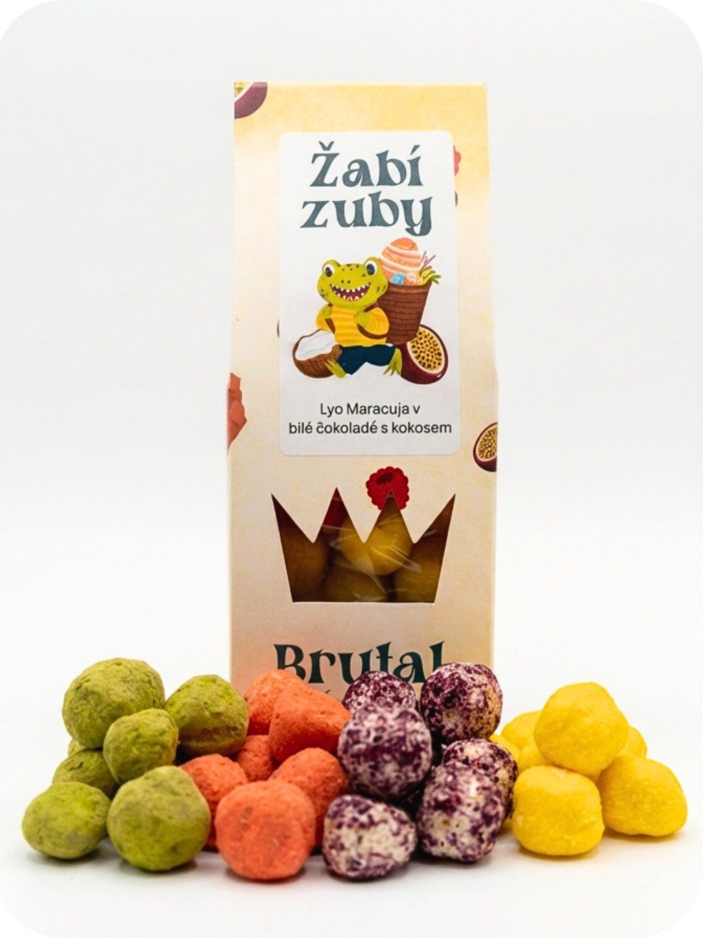 Bru(n)tální zážitekBílá čokoláda, lyofilizovaná maracuja a kokos. Tři ingredience, které spolu normálně nemluví, ale teď se dohodly na jednom: budou brutal. Kokos ti dává ten exotický základ, maracuja tě nakopne kyselostí a bílá čokoláda to drží pohromadě, aby ti to nerozervalo chuťové pohárky. Výsledek? Něco, co vypadá jako experiment, ale chutná jako zjevení.