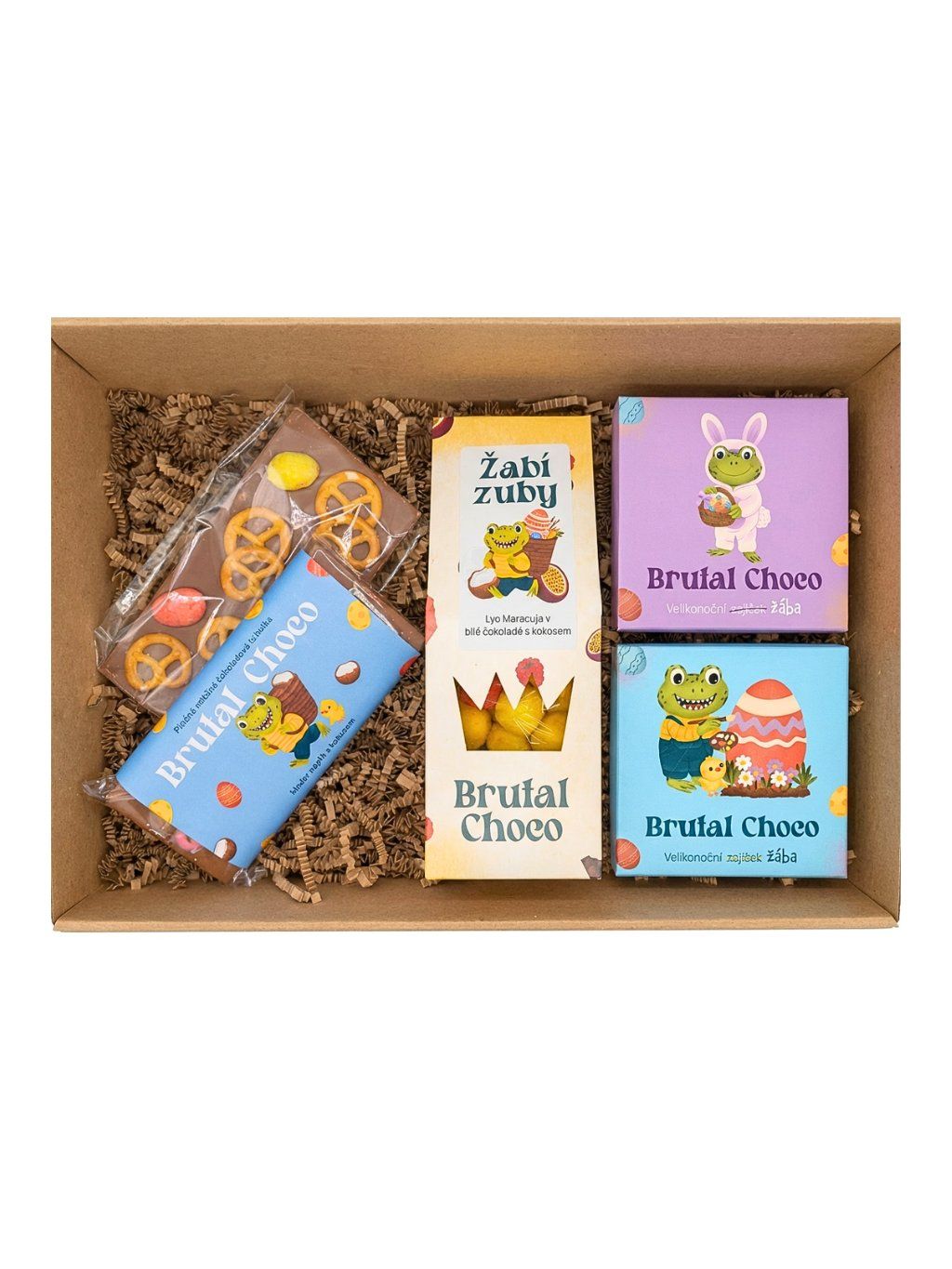 Obsah boxu: Malá velikonoční bonboniéra 2x (fialková a modrá) , velikonoční Žabí zuby, velikonoční sypaná tabulka, plněná mléčná tabulka: Kinder a kokos