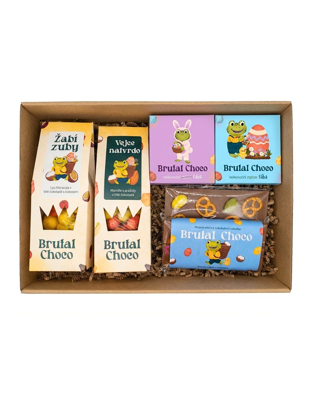 Obsah boxu: Malá velikonoční bonboniéra (modrá a fialková), velikonoční Žabí zuby, velikonoční mix ořechů: Vejce natvrdo, velikonoční sypaná tabulka, plněná mléčná tabulka: Kinder a kokos