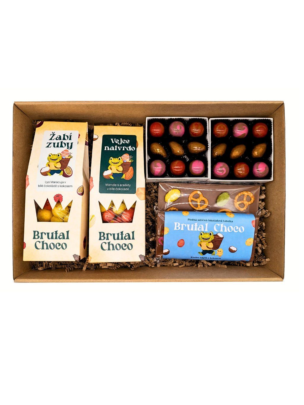 Ultimátní koleda. Od křupavých ořechů přes barevné pralinky až po speciální žabí zuby. Největší nálož barev a čokolády v limitovaných obalech, co se nám do krabice vešla.